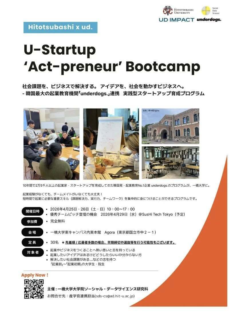 2026年4月25、26日に一橋大学で行われた日韓連携による実践型起業教育「Hitotsubashi x ud. U-Startup “Act-Preneur”Bootcamp2026」にコーチとして参加しました。